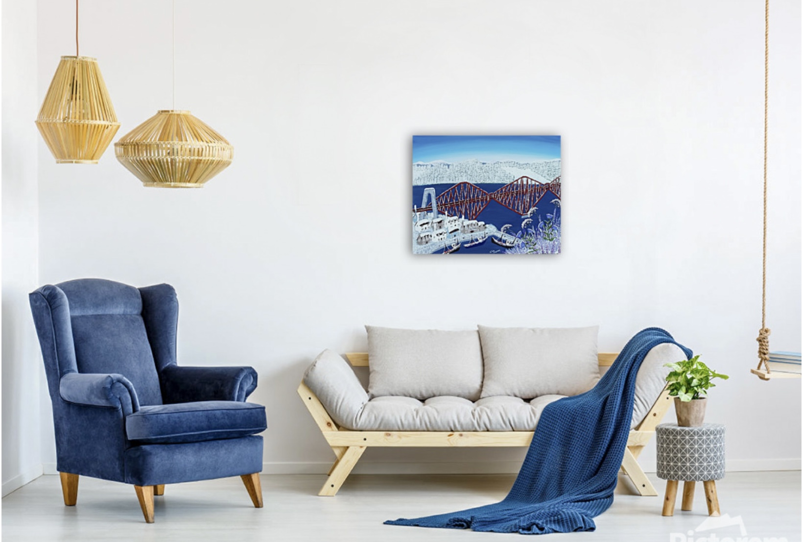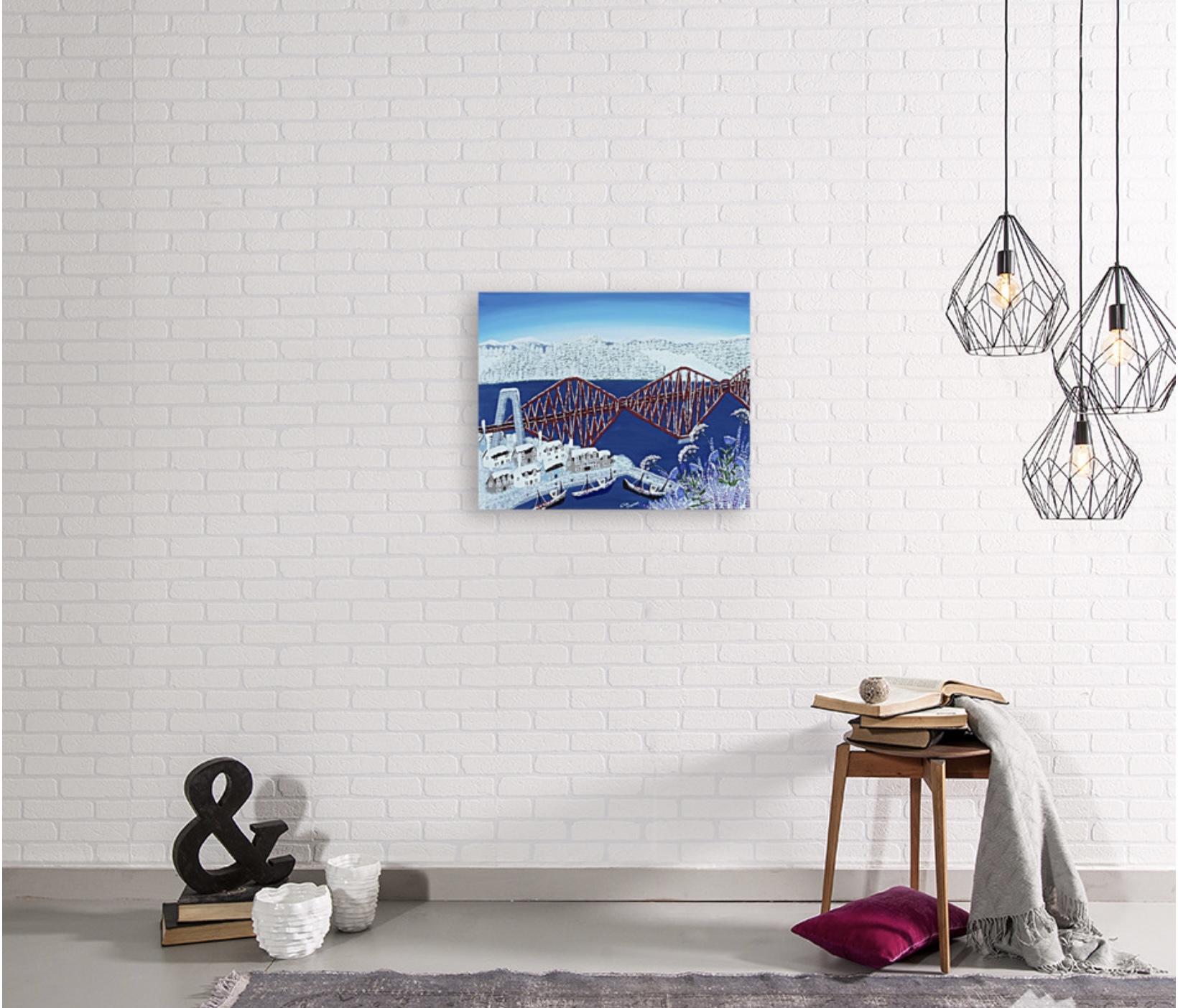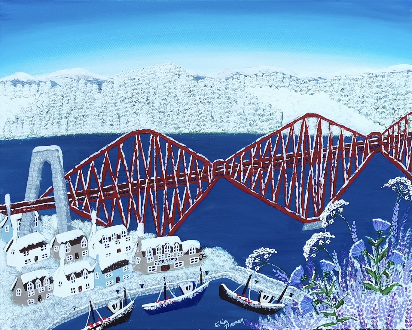 Inspired by the beautiful Forth Rail Bridge in Scotland which I used to travel over on my way to work in Edinburgh. Beautiful on a wintery day with snow covered roofs on the village below and chimney smoke rising upwards. Scottish thistles and heather covered in frost overlook the scene. Brings tranquil feelings to any space. Painted in richly pigmented acrylic and oil heavy bodied paints adding texture to the painting and vibrant colour. Painted on a quality 20 x 16 inch canvas created by a local framer, can be hung as is with white sides or framed as in example photos. I am a member of the Association of British Naive Artists whose work has sold in galleries to customers internationally with great reviews. Artwork will be sent carefully packaged with a certificate of authenticity. Free postage in the U.K. please contact for overseas quote.